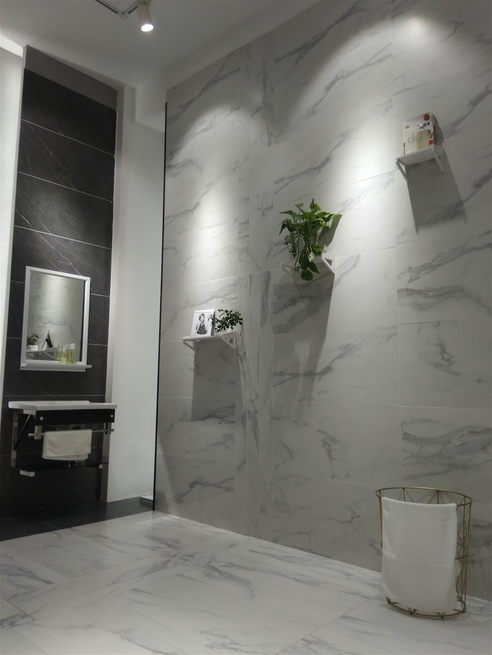 這是金艾陶新款的廚衛噴墨瓷片,卡拉卡白元素的瓷片優雅,非常適合現代風和輕奢風的裝修。