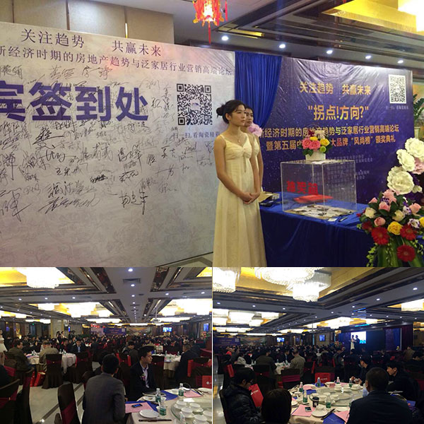 2014年12月27日下午,由國際建筑裝飾室內設計協會、臺灣海峽兩岸文化經貿保障促進會攜手美家網共同策劃“拐點!方向?”新經濟時期的房地產趨勢與泛家居行業營銷高端論壇暨第五屆中國家居十大品牌“風尚榜”頒獎典禮,在佛山華夏大酒店四樓舉行。金艾陶瓷磚在本屆典禮上,榮獲“微晶石十大品牌”、“全拋釉十大品牌”,同時再次榮膺“陶瓷一線品牌”。