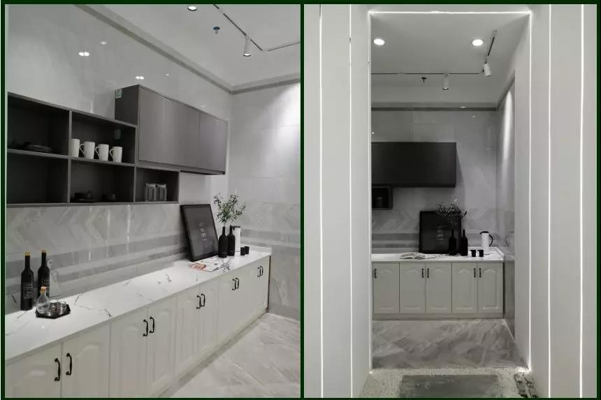 800*800樣板展示區,以色彩置為參照圓點,延伸出了以雪白而略帶灰度的空間基底,帶有肌理感的瓷磚樣板,用顏色和亮度的不同,區分空間的層次;結構線條和香檳金鋼條陣列相間,對于金屬紐帶的回應,穿插在空間的每一個小細節中;
