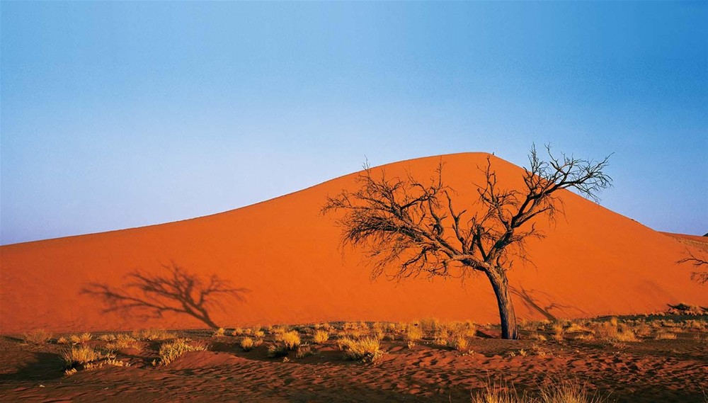 納米布沙漠是世界上最古老的沙漠之一,而且是唯一的一個(gè)紅色沙漠。它被一條干涸的河道分為南北兩個(gè)部分,北部以礫石平原為主,南部則主要是連綿的大沙丘,有的地方高達(dá)200米。“納米布”在當(dāng)?shù)氐恼Z(yǔ)言里,意思是“什么也沒(méi)有的地方”,但在我看來(lái),這里不僅有,而且還很多;最多的,就是美!