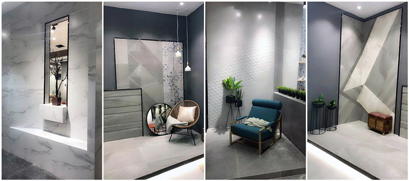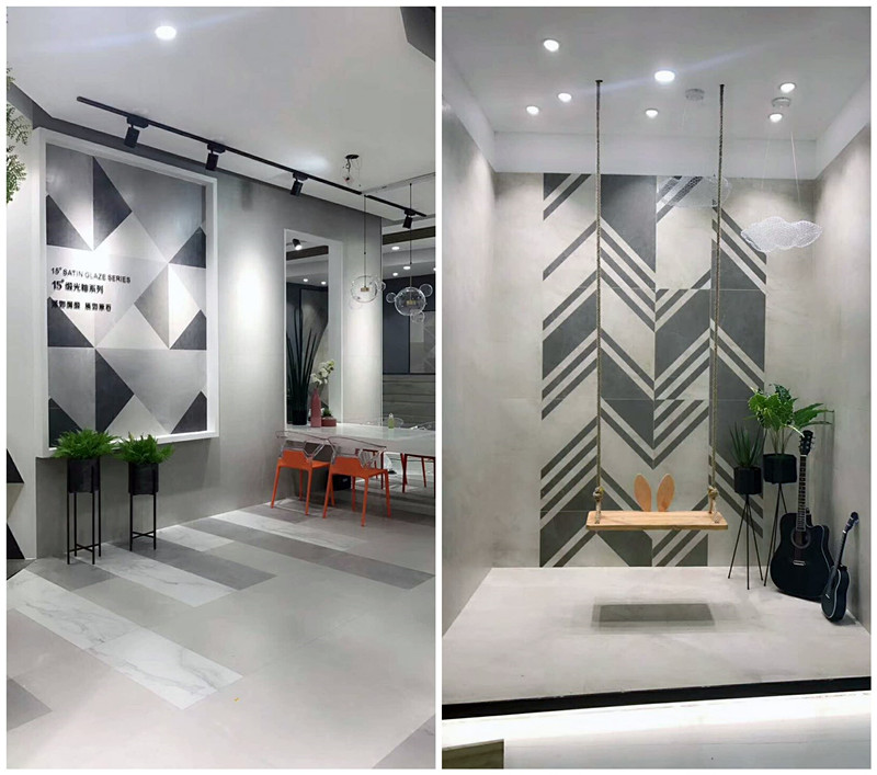 新展廳主要運用現代仿古磚阿瑪羅尼、15°緞光釉產品,主打現代簡約風格,個性獨特的燈飾,沉穩大