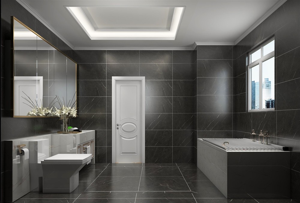 衛生間是一個比較私密性的空間,設計師采用深灰色的15°緞光釉鋪貼,簡單的鋪設演繹出現代歐式空間的簡約大方之美,白色簡單雕塑的門、浴室柜、天花板等給空間適當地留白,提亮了整個空間。